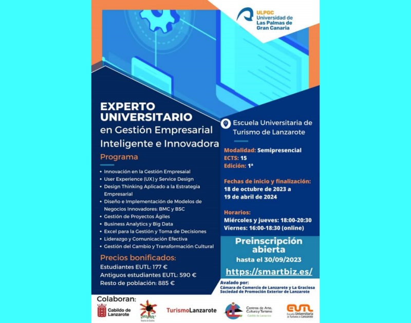 La universidad de Las Palmas de Gran Canaria abre la preinscripción del la primera edición del curso de Experto Universitario en Gestión Empresarial Inteligente e Innovadora, que se desarrollará del 16 de Octubre de 2023 a 19 de Abril de 2024 y que se impartirá en la Escuela Universitaria de Turismo de Lanzarote.