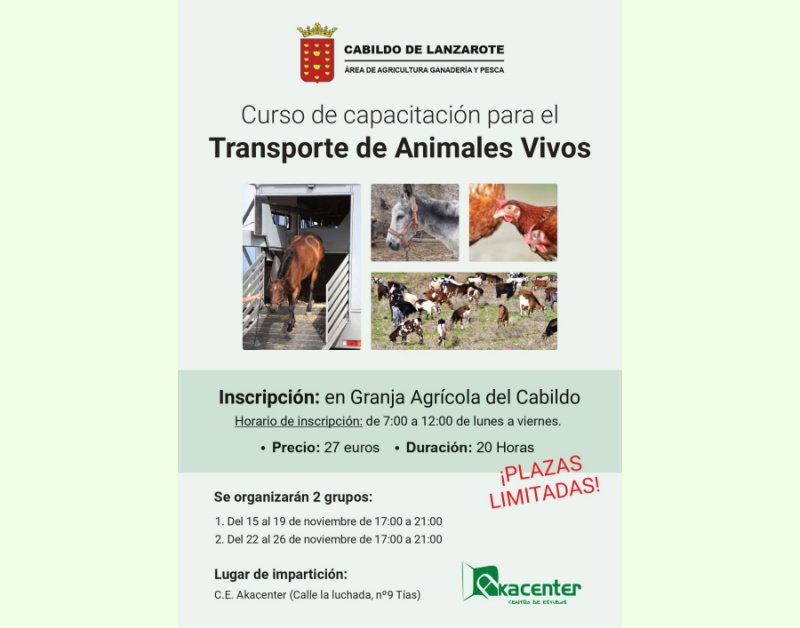 El Cabildo de Lanzarote, a través del área de Agricultura, Ganadería y Pesca, que gestiona Ángel Vázquez, impartirá un curso de bienestar animal en el transporte, destinado a las explotaciones ganaderas y transportistas de animales vivos. Las inscripciones, que comienzan el prócimo 2 de noviembre, se realizan en la Granja Agrícola del Cabildo, de lunes a viernes en horario de 7:00 horas a 12:00 horas.