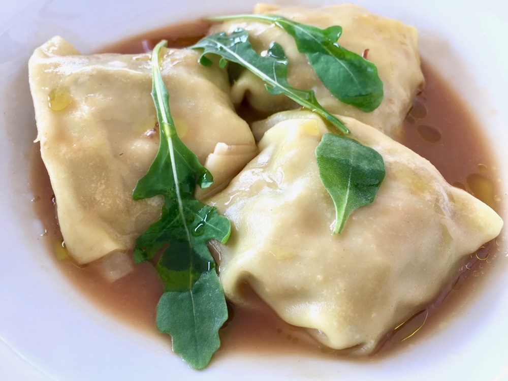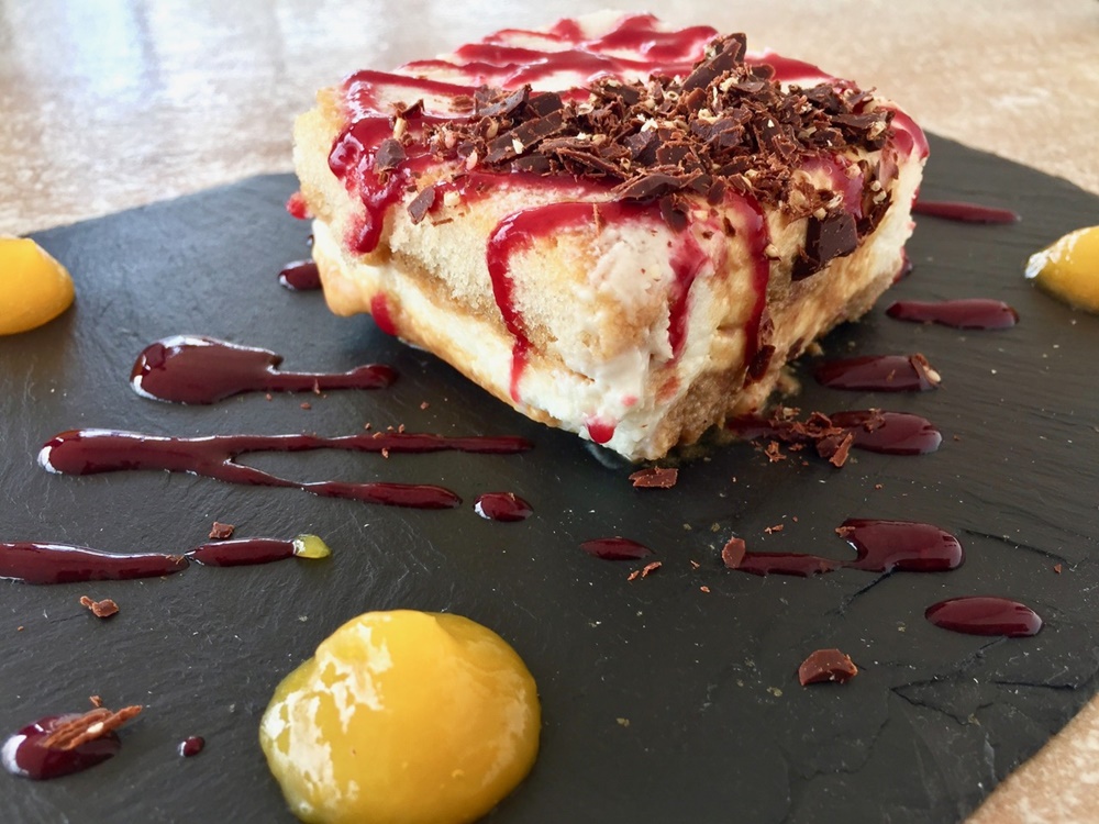 Uno de los platos más redondos a mi parecer son los “raviolis asiáticos de masa wanton rellenos de pato desmigado y demiglace de sus huesos”. Para acabar con un Tiramisú de Mousse de chocolate blanco con espuma de café al Amaretto y peta zetas de chocolate”.