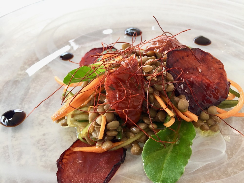 La nueva carta del Chef Manu Liria presenta nuevos platos y sugerencias que ofrecen fuera de carta, con productos de temporada que van rotando continuamente. De entrada les sugiero la “ensalada fría de lentejas de Lanzarote, verduritas y aliño tailandés con aroma de Galanga” (jengibre rosa) o “carpaccio de higos con lascas de parmesano y piñones tostados y vinagreta de balsámico”, que curiosamente ha pasado de ser un postre en sus inicios, a convertirse en uno de los entrantes más solicitados. En pescados destacan los “lomitos de vieja de la isla empanados al pimentón de la Vera sobre puré Cressy de zanahoria y fondo de pescado” o el “lomo de sama en cocción lenta, leche de coco y hojas de lima Kaffir”, que aportan un distintivo toque asiático al plato, sobre un pastel de espinaca con frutos secos.