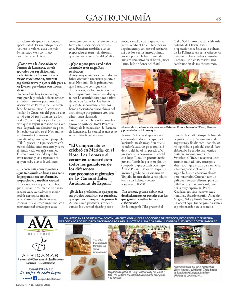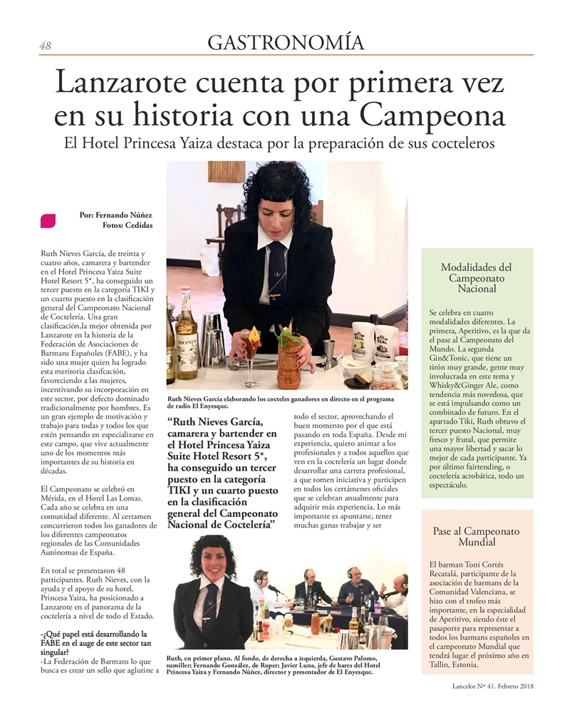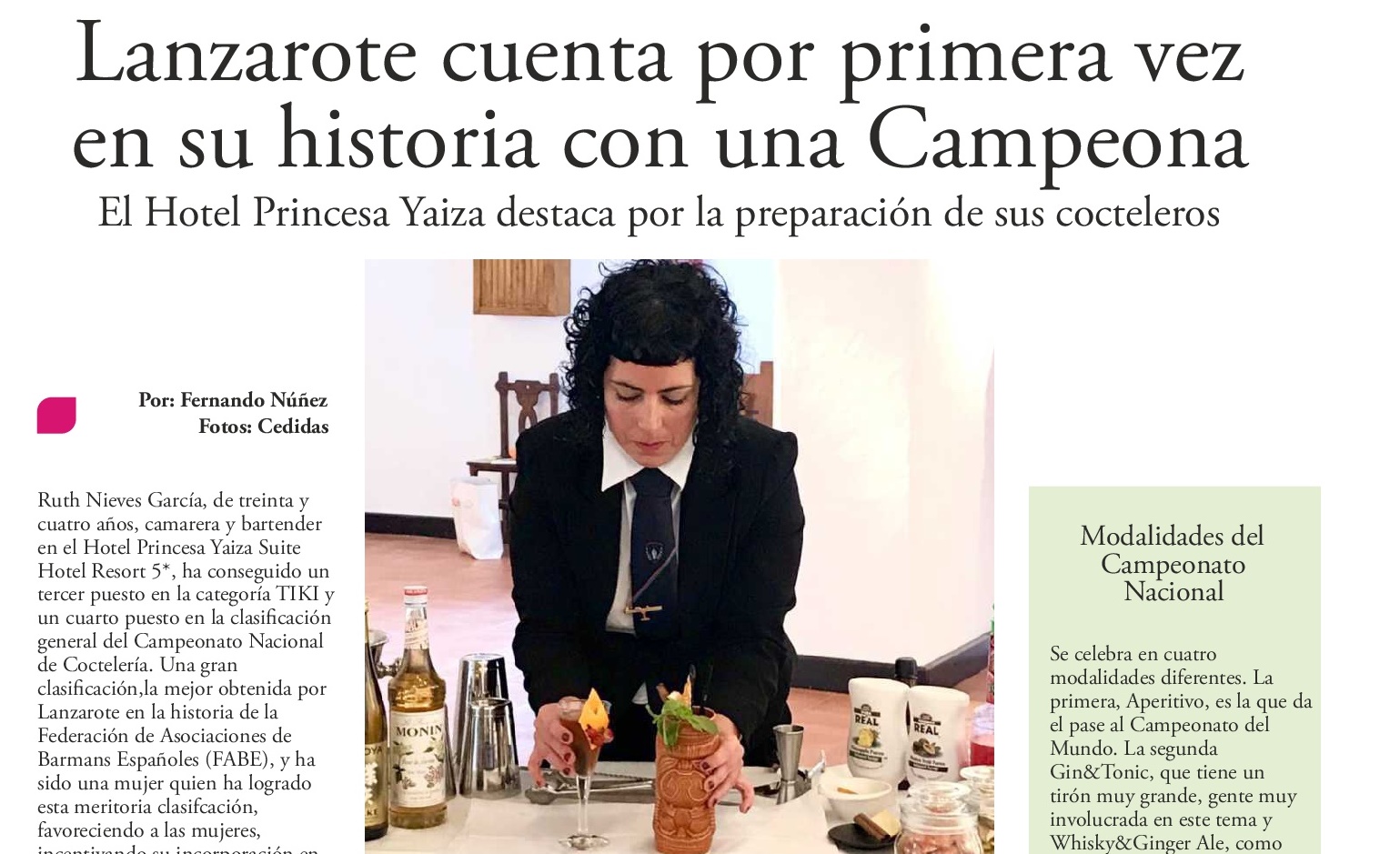 Este artículo corresponde al mes de febrero. Ruth Nieves García, camarera y bartender en el Hotel Princesa Yaiza Suite Hotel Resort 5*, consiguió un tercer puesto en la categoría TIKI y un cuarto puesto en la clasificación general del Campeonato Nacional de Coctelería 2018. Una gran clasificación, la mejor obtenida por Lanzarote en la historia de la Federación de Asociaciones de Barmans Españoles (FABE), y fue una mujer quien ha logrado esta meritoria clasificación, favoreciendo a las mujeres, incentivando su incorporación a este sector, dominado tradicionalmente por hombres.