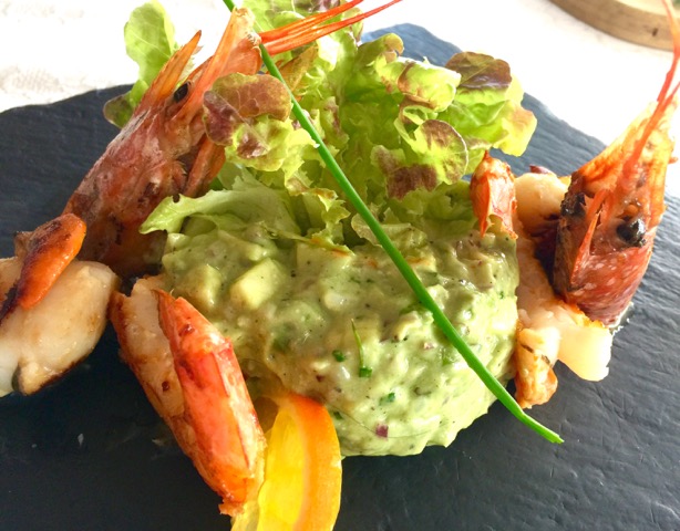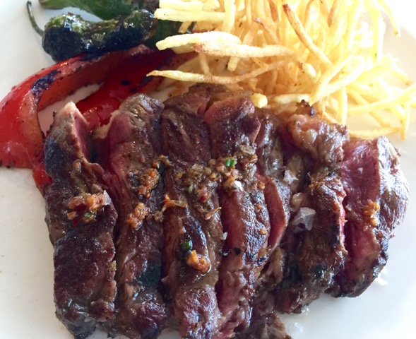 Comenzamos con un “Carpaccio de langostinos”, en principio con una buena presentación, un suave y equilibrado sabor que por su condimentación lo hacía estar a medio camino entre un delicado ceviche y un carpaccio, excelente. Siguió un segundo entrante también en sintonía con el primero, “Tartar de aguacate (perfectamente aliñado) con vieiras y langostinos”, una refrescante y sabrosa propuesta. Y acabamos esta parte de la comida con “Rejos de pulpo de La Tiñosa a la brasa en crema de batata ligeramente picante, da gusto sentir esa carne firme y a la vez tierna, en su punto exacto de cocción y un ligero toque picante muy agradable. De ahí pasamos a un “Atún en salsa Teriyaki”, la salsa de cine, aunque aquí el atún se pasó un poquito en plancha, teniendo en cuenta que el punto el atún debe ser tirando a poco hecho, aun así se reconoce una buena y fresca materia prima. Para acabar nada mejor que un buen lomo de cebón a la brasa, este si que en su punto exacto, marcado por fuera y rojo, tierno y jugoso en el centro.