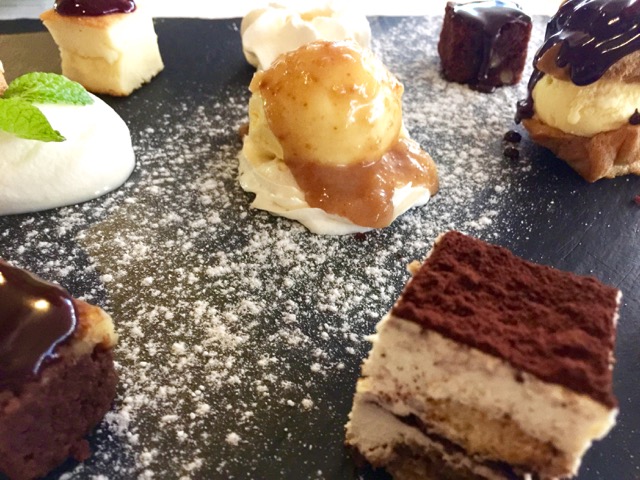Cerramos con una degustación de postres caseros (menos el helado), que llevaba brownie, tarta de queso con frambuesa, helado con bienmesabe, profiteroles con crema de chocolate y tiramisú casero.