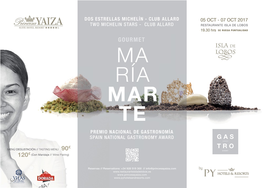 El Princesa Yaiza Suite Hotel & Resort 5*L de Lanzarote, perteneciente a la cadena PY Hotels & Resorts, contará con la chef dos estrellas Michelín, María Marte en unas jornadas gastronómicas que estarán desde el 5 hasta el 7 de octubre en el restaurante gourmet Isla de Lobos.