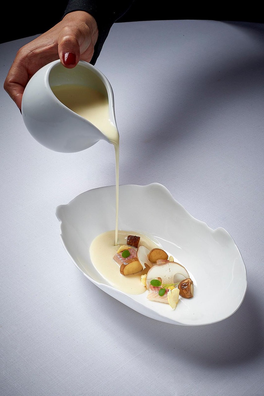 Juanlu Fernández, por su lado, con sus elaboraciones sorprendentes donde se siente la historia clásica de Escoffier divirtiéndose con desparpajo en Andalucía, con platos como la lubina ahumada en frío, piriñaca fermentada y tomates asoleados; la pescadilla de la bahía en amarillo; la yema de huevo curada 90 días, potaje Ibérico, praliné de almendras fritas y vieiras; o la monumental royal de cerdo Ibérico.