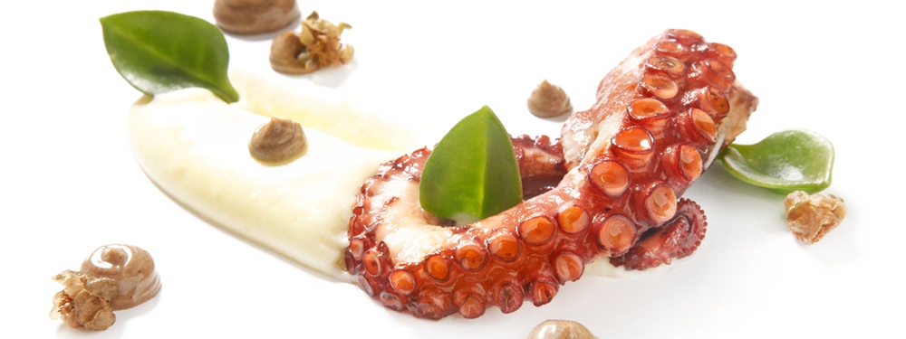 Pulpo con parmantier de patata, emulsión de ajo negro y alcaparras