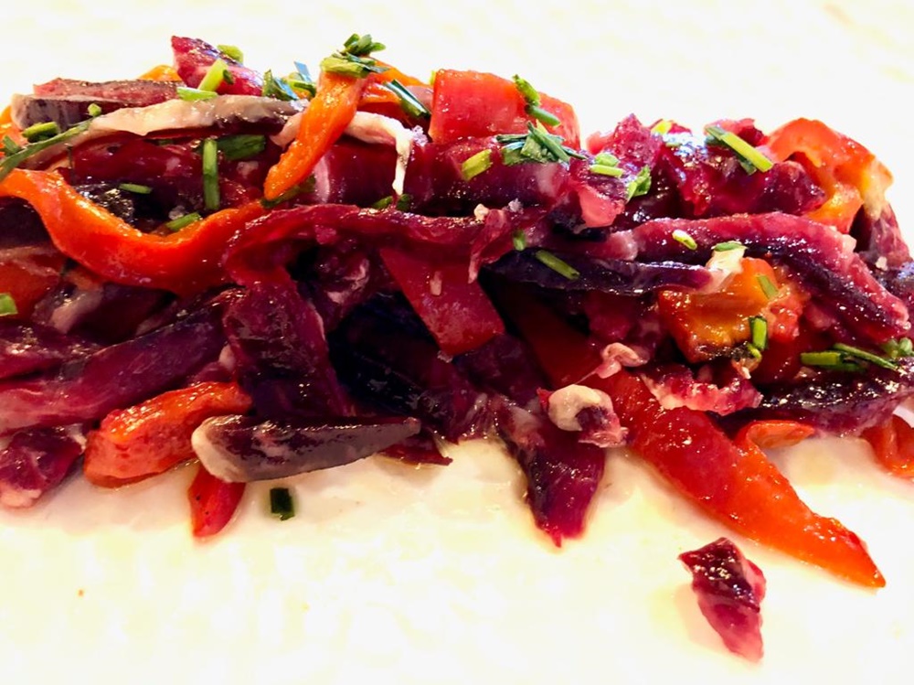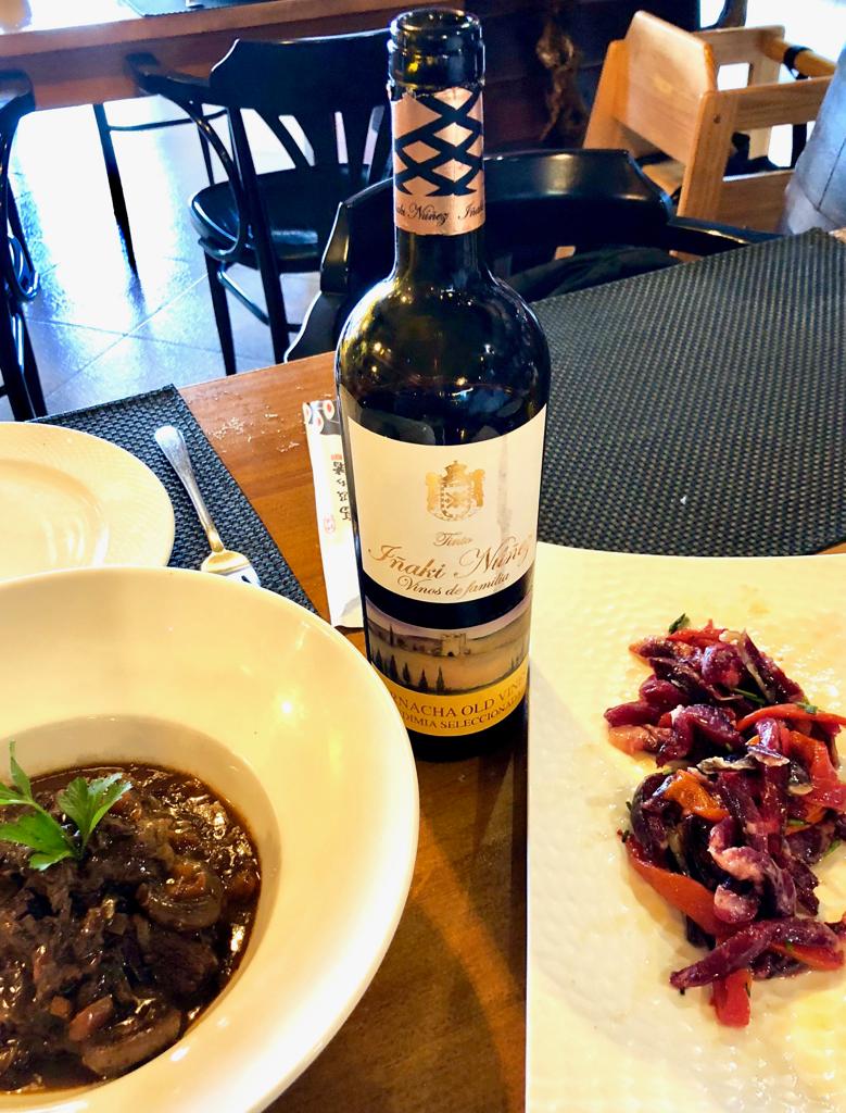 Las carnes que maduran 60 o 90 días tienen la característica que las tapas de las piezas maduran de cómo si una cecina se tratase, pero con la particularidad de que en este caso al que me refiero, era una pieza de Black Angus. Pues bien, comenzamos la comida degustando un Vermut Lustau, que hace justicia a la tradición del mejor Vermut de Jerez. Un perfecto ensamblaje de dos vinos con más de 10 años de crianza en Solera y Criaderas: un amontillado seco y un Pedro Ximénez dulce y aterciopelado que armonizaba a la perfección con un nuevo plato de Juan: “virutas de de Black Angus madurado, hidratado con Oliva Virgen y pimientos asados a la leña”, que plato tan bueno y que combinación tan acertada.