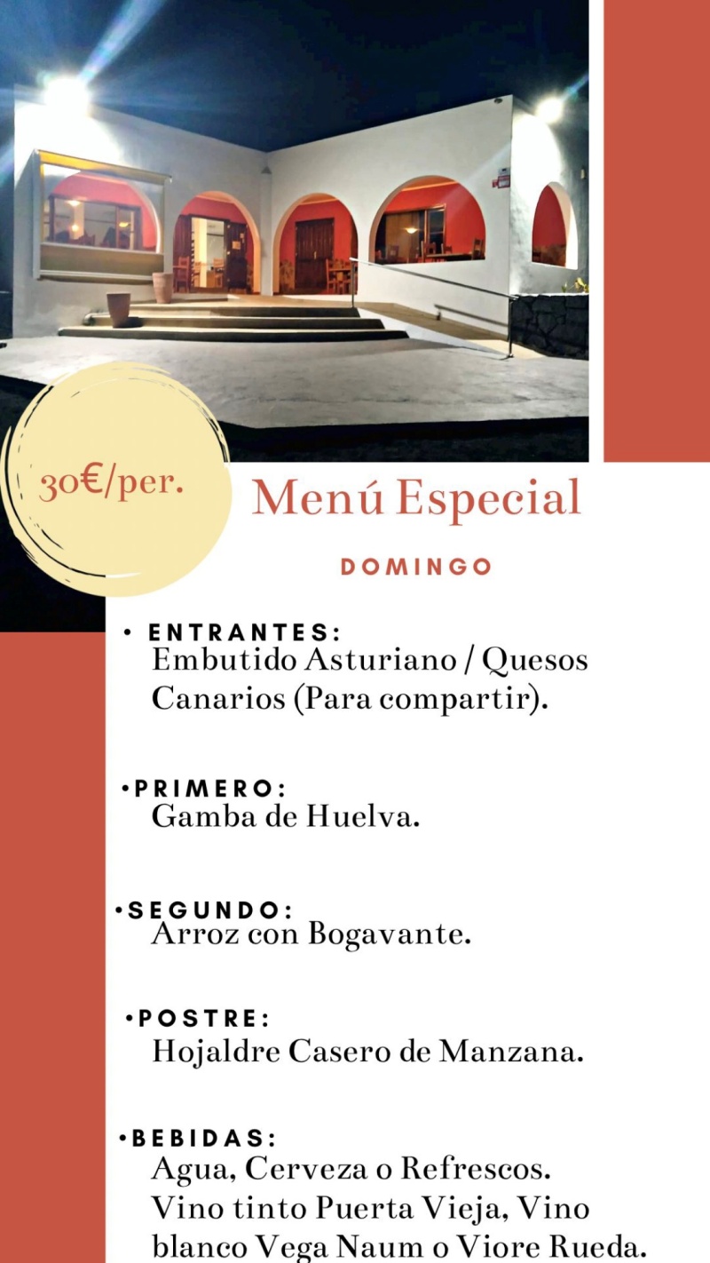 También todos los domingos ofrece un “Menú Especial”, compuesto por: embutido Asturiano y Quesos Canarios de entrada; seguido de Gambas de Huelva; Arroz con Bogavante como plato principal y Hojaldre Casero de Manzana de postre. El menú, incluye agua, cerveza, refrescos, vinos blancos Vega Naum o Viore de la denominación Rueda y vino tinto Rioja, Puerta Vieja. Todo a un interesante precio de 30 € por comensal. También los domingos cuentan con música en vivo, con el “Trio Canario-Cubano” en la terraza de 15: a 17:00 horas.