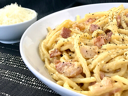 Espaguetis a la carbonara con nata para toda la familia (receta fácil)