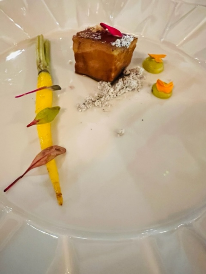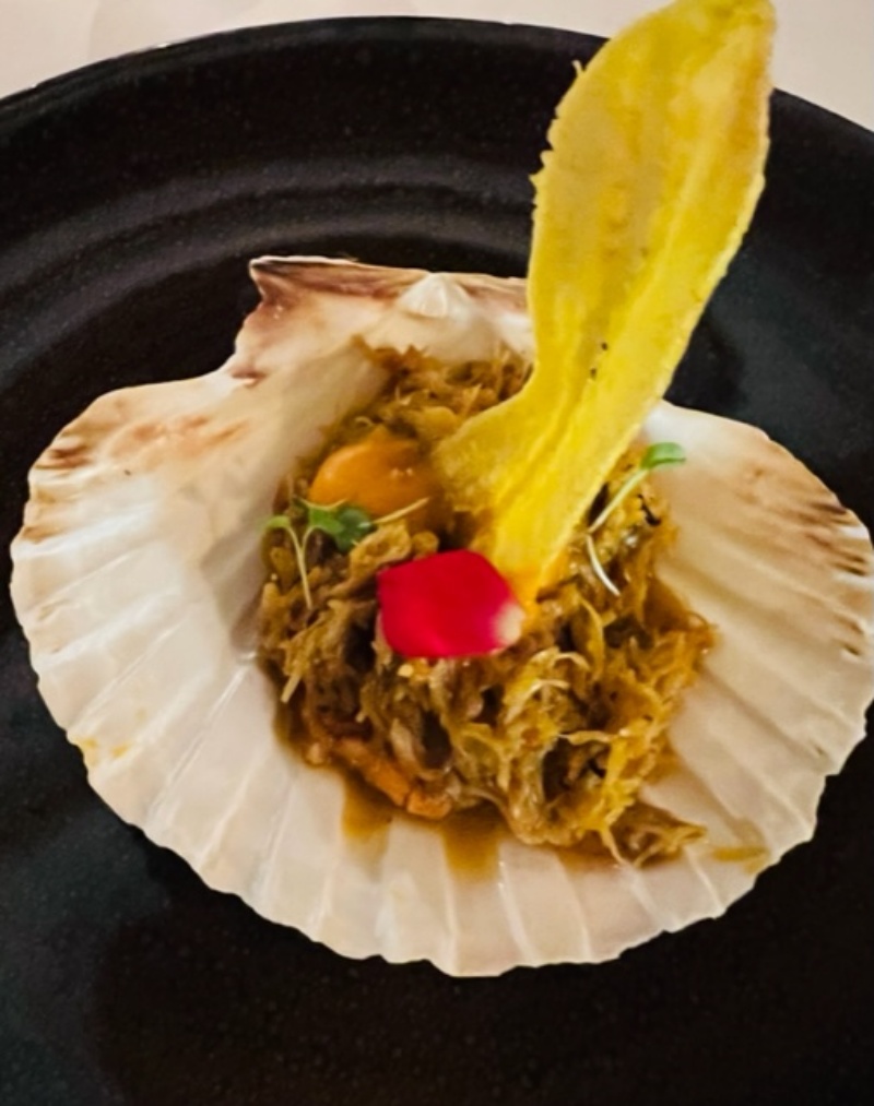 Su menú nos trajo como entrante un “Caldo de gallina, hierbas de Azotea y Pandebono”, simple y deleitoso. Sobre una vieira llega un “Encocado de Cangrejo de profundidad y Chontaduro”, basado en un plato de Cartagena de Indias, donde el cangrejo se mezcla generosamente con el coco reducido y chontaduro, que es el fruto de la palma, con lo que se hacen las Marimbas en Colombia; un gran plato lleno de matices y potentes sabores. Después nos sorprendió con un “Ravioli de Morcillo Negro y Queso curado de Lanzarote”, una elaboración de mucho tiempo con hierbas y especias; le acompaña una salsa de su propio jugo y el portentoso queso de pasta de la Finca de Uga, Don Nicolás, una carne muy jugosa, compleja de sabores, rica y aromática. Nel volvió sobre sus pasos con una “Patarashca de Lubina y Yuca”, un plato procedente de la Amazonia Colombiana, un plato que lo hacen con pirañas, yuca, hierbas y una salsa con tomate, cebolla, cilantro, comino y yuca; espléndido. El último plato del maestro Nel, “Chicharrón Glaseado con Panela y Tamarindo”, caramelizado, crujiente y acompañado por su ceniza y una zanahoria antigua, bocado perfecto como broche de un portentoso menú.