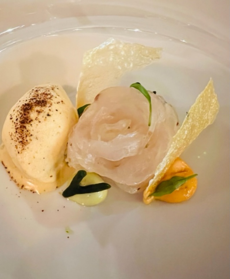 Comenzó con una “Royal de cebolla y su caramelo”, producto que durante años mantuvo una producción lo suficientemente importante para exportarse a otras islas, con un ligero aporte de millo, sabrosa. Siguió con una versión muy personal del “Sancocho Canario”, puntos de mayonesa de mojo rojo, helado de papa de Lanzarote con liofilizado de mojo, chip de papa, alga nori y guacamole, realmente extraordinario. La papa se significa por si misma en el menú como “Papas a la Importancia”., con una sutil emulsión de plancton y pescado con espuma de azafranillo. A continuación, “Caldo de pescado con Vieja soasada y Azafranillo Canario”, presentado con una galleta realizada con las mismas escamas de la vieja, sorprendente a la vez que delicioso. Los postres corrieron a cargo del Chef residente, Calzadilla. “Plátano con chocolate, servido con un cóctel Tajogaite (brandy, licor de cacao, batido de chocolate, nata y nuez tostada). Carro de queso de Finca de Uga y Petit Four de mantecado de gofio”.
