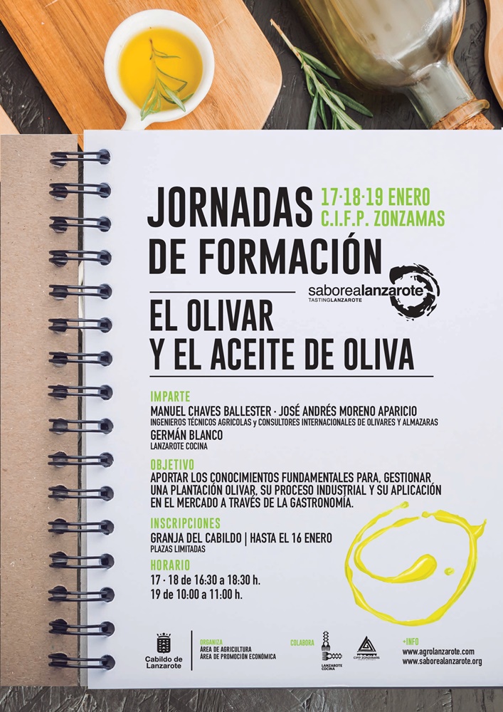 El Cabildo de Lanzarote a través de las áreas de Promoción Económica y de Agricultura que dirigen los consejeros Ángel Vázquez (PP) y Antonio Morales (CC) respectivamente, organiza unas 'Jornadas de formación Saborea Lanzarote: el olivar y el aceite de oliva' que se celebrarán del 17 al 19 de enero próximos en el Centro Integrado de Formación Profesional Zonzamas de Arrecife, que colabora en su organización al igual que el colectivo Lanzarote Cocina.