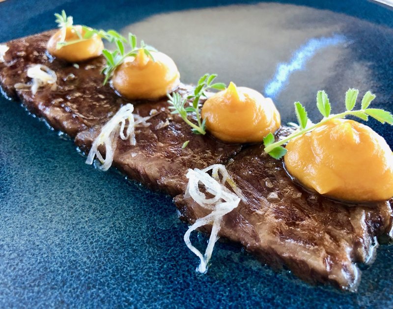 Acabamos el recorrido salado con un plato que ya apunta maneras para la nueva carta de otoño: Taco de Wagyu madurado en miso con encurtido de nabo y puré de batata. Este plato ya refleja hacia donde quiere evolucionar la cocina de Kentia. Platos con menos pasos e ingredientes en los que el producto sea el gran protagonismo. “Hasta ahora hemos hecho una cocina con mucha técnica y muchas preparaciones. Ahora al disponer de una finca propia el hotel, el jefe de cocina será la fincaMachinda, Hay cosas en las que vamos a dar un cambio en la nueva carta, habrá novedades”, señala Brandao.