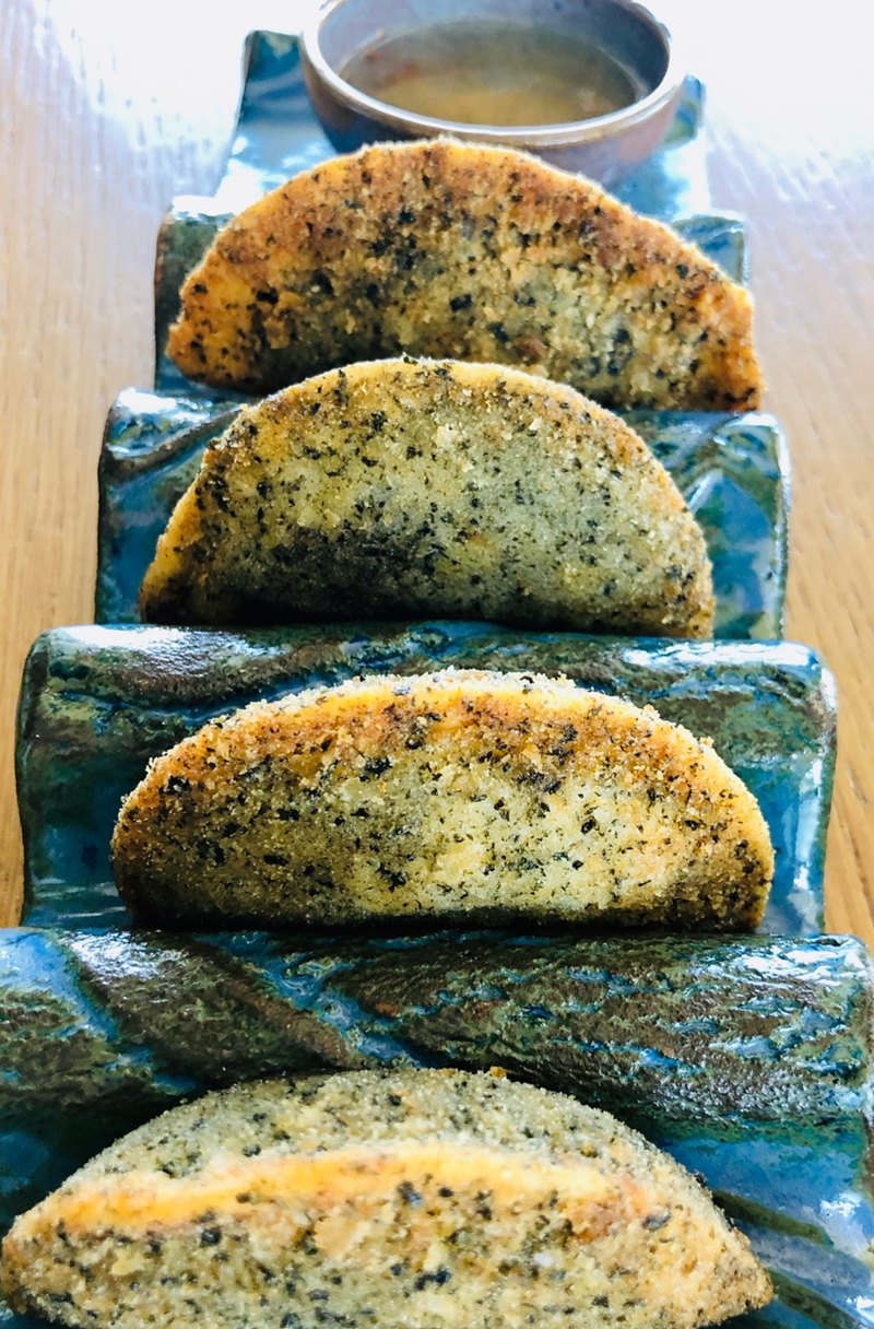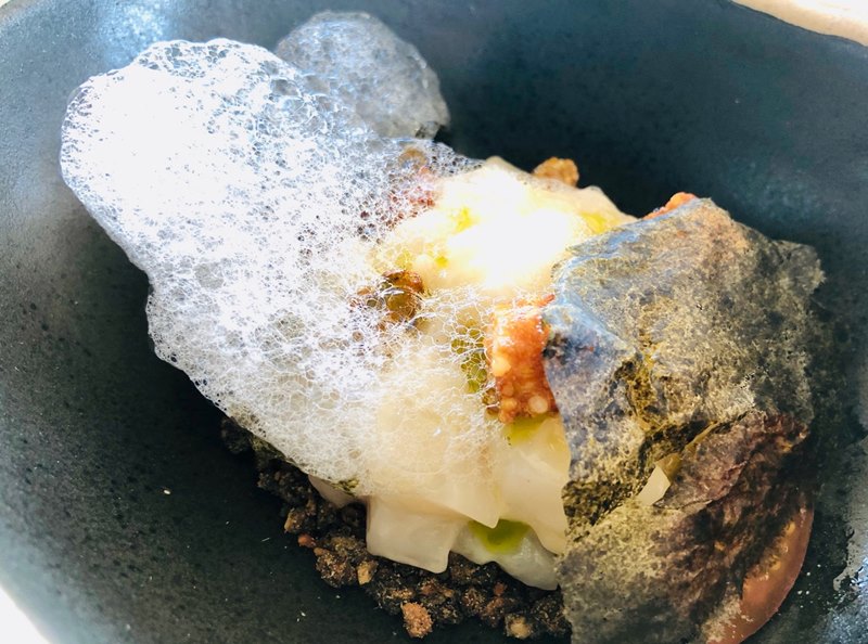 Un plato en el que la salsa funciona como elixir potenciador: “empanadillas rellenas de calamar sahariano, panko y alga nori, acompañadas de salsa nuoccham”. Elaboran tanto la masa como el relleno.La salsa lleva base de mirin, enriquecida con guindilla y colatura de anchoa. Sabrosa combinación.