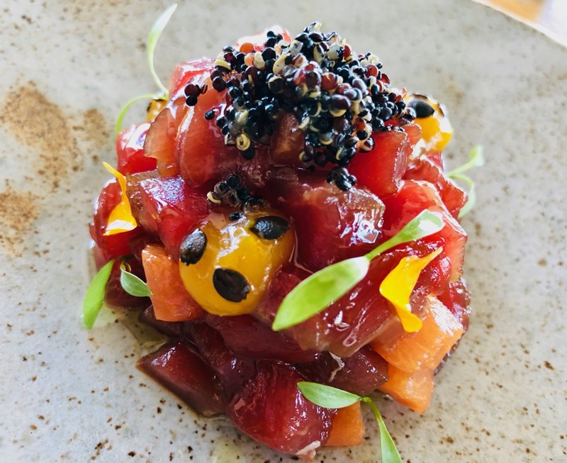 Otra muestra del conocimiento que desarrolla este equipo de cocina es el “poke -plato de origen hawaiano-de atún Balfegó,con gel de mango, acompañado con papaya fermentada y coronado con quinoa negra y brotes de cilantro”. La quinoa aporta el punto crujiente para que las texturas no sean tan neutras, buscando el contraste y los brotes de cilantro aportan frescor. Un plato complejo y preciso resuelto en nivel de excelencia.