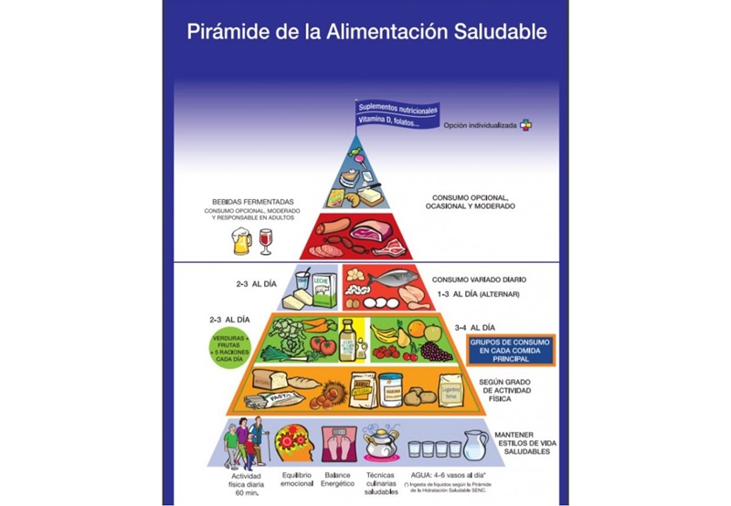 Esta pirámide, que está contenida en las nuevas Guías Alimentarias para la Población Española de la SENC y que se presentó el pasado mes de marzo, no sólo recoge los alimentos que debemos tomar y con qué frecuencia, sino que incluye por primera vez una serie de recomendaciones para llevar una vida saludable como es el hacer una hora de actividad física diaria.También se destaca la importancia de tener un buen equilibrio emocional, de que haya un balance energético que implique más movimiento conforme más consumamos, de usar técnicas culinarias saludables y de beber de cuatro a seis vasos de agua al día para estar hidratados.