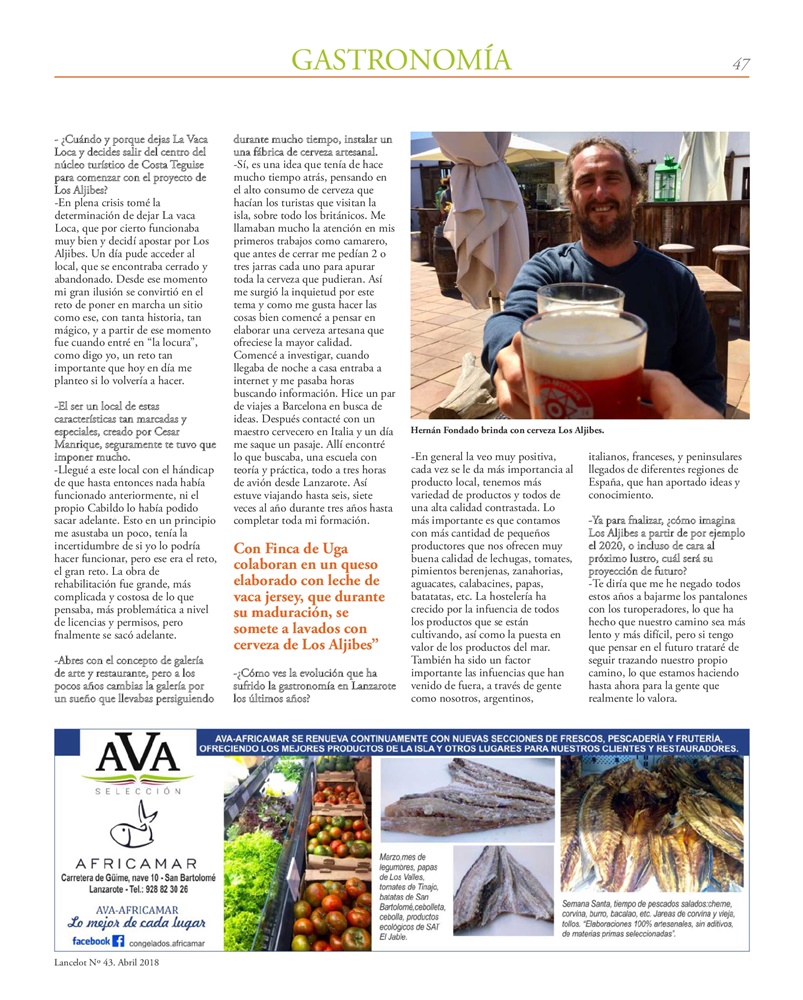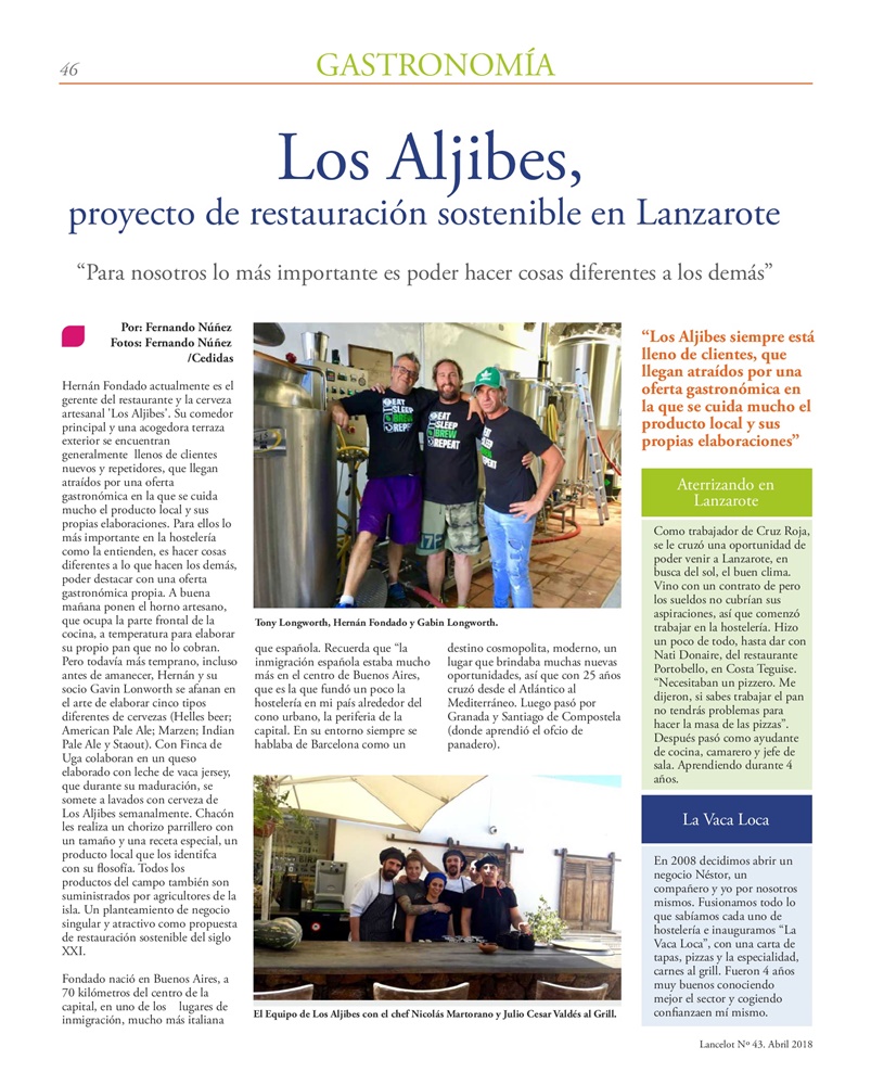 Este artículo corresponde al mes de Abril.El restaurante "Los Aljibes" es un proyecto de restauración sostenible. Ofrecen una oferta gastronómica en la que se cuida mucho el producto local y sus propias elaboraciones. Elios también elaboran una cerveza artesanal que lleva el mismo nombre que el restaurante.