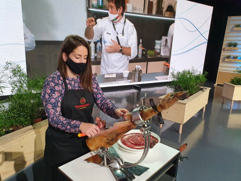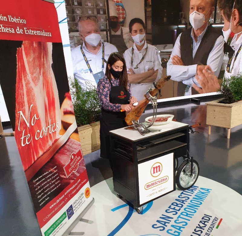 El jamón 100% ibérico de bellota Montesano Extremadura, de la DO Dehesa de Extremadura, se convirtió, a lo largo de los cinco días del congreso, en el aperitivo y merienda oficiales de los chefs nacionales e internacionales que acudieron a San Sebastián Gastronomika, estando presente, en riguroso directo mañana y tarde, en el plató central.