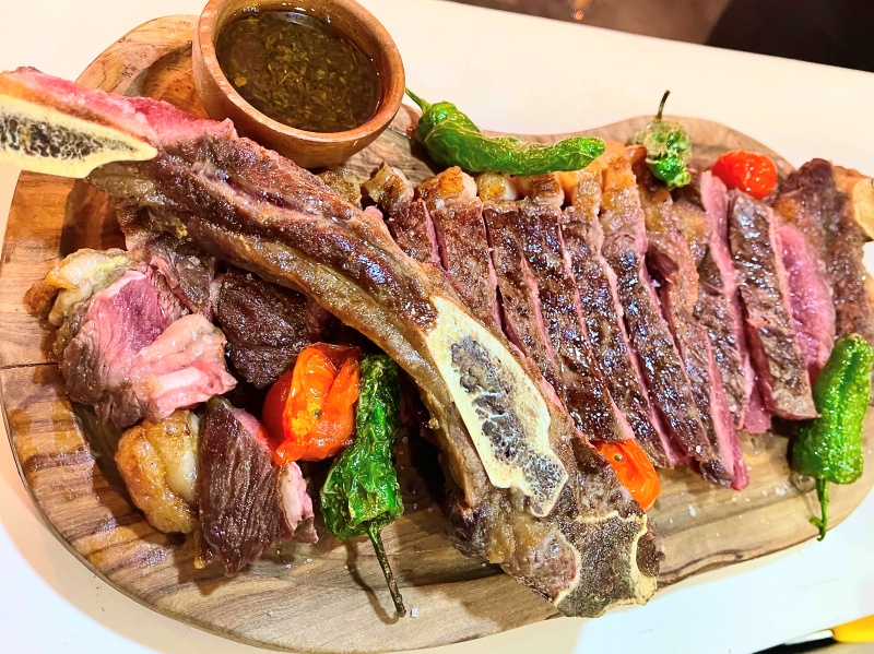 Las carnes adquieren relevancia: “rollo crujiente, rebozado en pistacho, relleno de guiso tradicional de rabo de toro, salteado con su propio jugo”; “pata de cordero a baja temperatura con Parmentier y mojo de menta”; “falso pato Pekín”; “hamburguesa 90 Millas”, y en cortes nobles de alta calidad: solomillo de Toro, entrecot de Angus, chuletón de vaca Rubia Gallega y una amplia selección a la brasa de carnes maduradas. La mejor manera de finalizar: tarta de queso Chanchan, con mermelada artesanal y vainilla; y Doña Maru, flan Cubano 5´0.