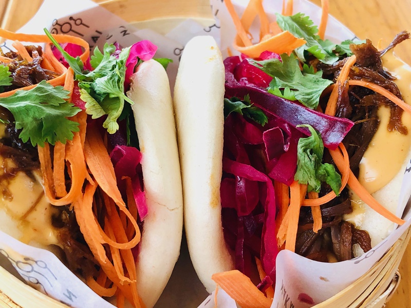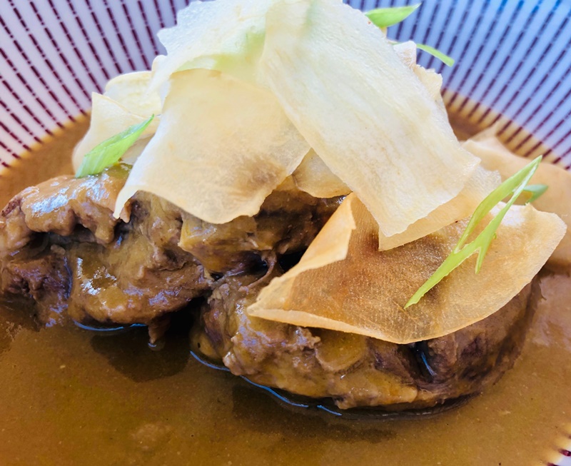 Ya metidos en faena comenzamos con “Nems de langostinos”, que se come como si fuera un taco envuelto en la lechuga al que se le añaden hierbas, menta, albahaca y chili dulce, correcto, sencillo pero creando buenas expectativas; seguimos con “Chirasi de salmón” -el plato que dio paso al exitoso Poke-, se compone de una base de arroz de sushi, salmón marinado en salsa de anguila ahumada, crema de aguacate y alga Nori, el salmón junto con la salsa actúa como un fuerte potenciador de los sabores del plato, realmente especial y sabroso; no faltó a la cita el pan “Bao relleno de pato”, con zanahoria, encurtidos y salsa hoisin”, otro acierto más; y finalmente “carrilleras con curry verde y chips de batata”, de cochino blanco, que como apunta jocosamente Jon -es que no hay tanto cochino negro para tanto restaurante-,es uno de los platos más redondos de la carta, muy equilibrado en sabores, ligeramente picante y punto perfecto de la carne.