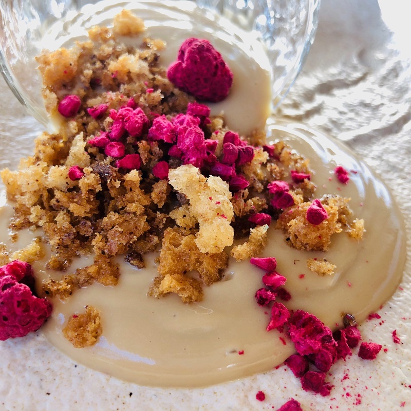 "Flan roto de moscatel migas dulces y frambuesa liofilizada"