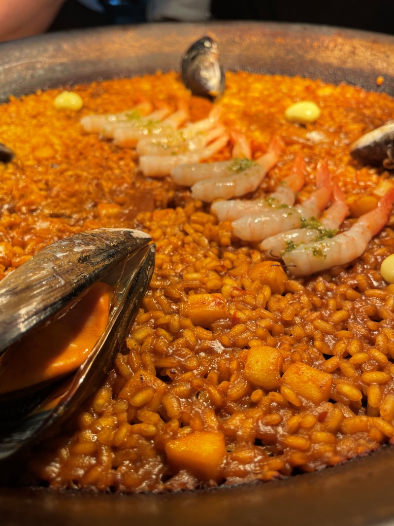 -En este momento se va a encontrar arroces. ¿Por qué arroces? Yo he vivido la mayor parte de mi vida en el Mediterráneo, echaba de menos comerme esos arroces aquí. Me explico, el arroz es todo generosidad, es un producto que a mi me entusiasma porque es un grano mágico, absorbe los sabores del aderezo, del caldo, del fumet que tu le hagas para devolvértelo enriquecido. Le estoy cambiando las bases, por ejemplo, en Levante, se utiliza mucho la salmorreta, que no deja de ser ajo, tomate y cebolla como una de las bases a la hora de hacer un arroz. Entonces yo hago una salmorreta canaria con su mojo picón y productos de la isla, porque quiero que te comas un arroz con pulpo, o con carne fiesta que sepa a Lanzarote. Otro apartado importante que está teniendo mucho éxito en la carta son los guisos, las lentejas, las arvejas con calamar pequeñito en tinta negra, judiones de aquí, siempre de aquí, con aceite de humo y lapas. El hojaldre de conejo con mojo rojo de chocolate, que nos parecía al principio un plato difícil, es probablemente el más vendido con otro que nos ha sorprendido el resultado mucho, un mar y montaña ´canarizado´, con calamar sahariano chiquitito relleno de un guiso de carne de cabra.