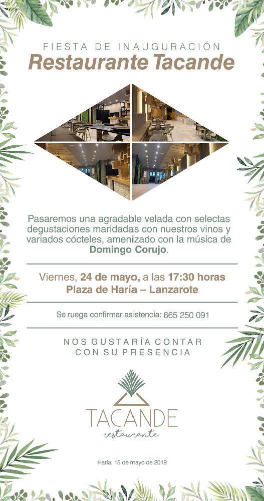 El próximo viernes 24 de mayo a partir de las 17:30 horas se inaugurará el nuevo restaurante Tacande, situado en el céntrico emplazamiento de la Plaza del Castillo, en Haría.