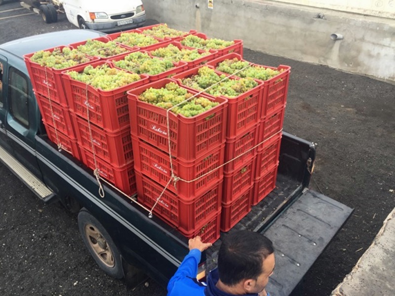 González, destaco que “la uva que nos está llegando del norte, viene fresca, en grandes racimos, con menos grado que la que nos viene de la zona de La Geria, donde incluso está llegando hasta los catorce grados, pero en ambos casos hay que destacar que se muestra muy sana. Se vendimia a primera hora para que llegue lo más fresca posible a Bodega, ya que el calor la oxida”.