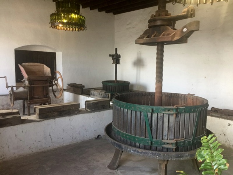 En primer lugar, en la zona de la exposición de prensas y maquinaria antigua que conserva la bodega, explicó la forma en la que antaño los habitantes de la isla elaboraban los vinos, en unas condiciones muy duras, que requerían un trabajo manual en la mayor parte de los pasos de producción para la obtención del vino, con la utilización de una maquinaria muy rudimentaria.
