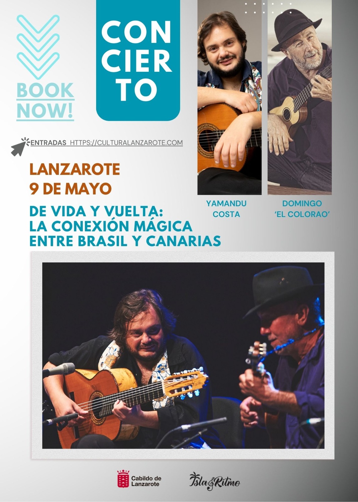 El guitarrista brasileño Yamandu Costa y el timplista canario Domingo Rodríguez ‘El Colorao’ arrancan la gira por Canarias de presentación de su trabajo conjunto este miércoles 8 de mayo en La Graciosa, y el 9 de mayo en Lanzarote.