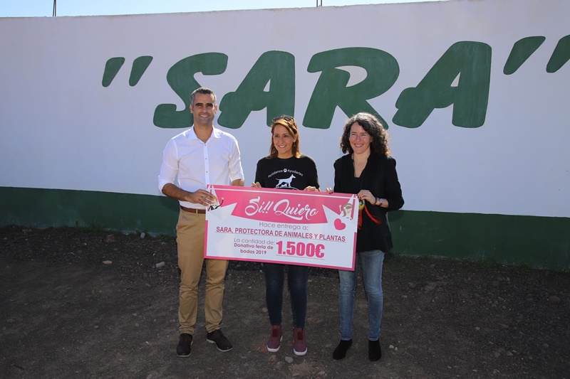 Esta mañana, la consejera de Industria del Cabildo de Lanzarote, Ariagona González, acompañada del alcalde de San Bartolomé, Alexis Tejera hizo entrega del dinero recaudado en la IV Feria de Bodas 'Sí Quiero Lanzarote' a la Protectora de Animales Sara.