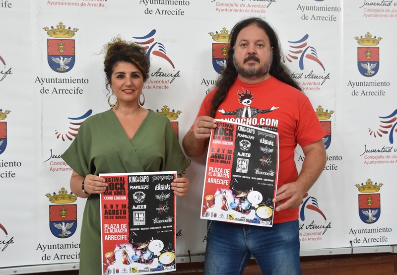 La concejal Elisabeth Merino, y el representante de la Asociación Musical y Cultural El Hoyo Sónico, Jonás Martín, presentaron esta mañana en rueda de prensa en la Casa de la Juventud de Arrecife, la 28 edición del Festival de Rock San Ginés, que en este 2019 amplía un día más sus actuaciones musicales teniendo como base el gran escenario en la plaza de El Almacén de Arrecife.