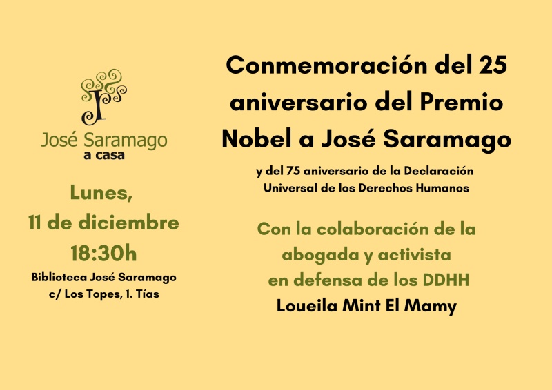 Precisamente la Casa Museo-Saramago, aprovechando el 25 aniversario de Premio Nobel de Literatura del escritor portugués, y los 75 años de la Declaración de Derechos Humanos, celebra un acto en la Biblioteca de la Casa de Tías, donde se reflexionará sobre lo que está pasando en el mundo.