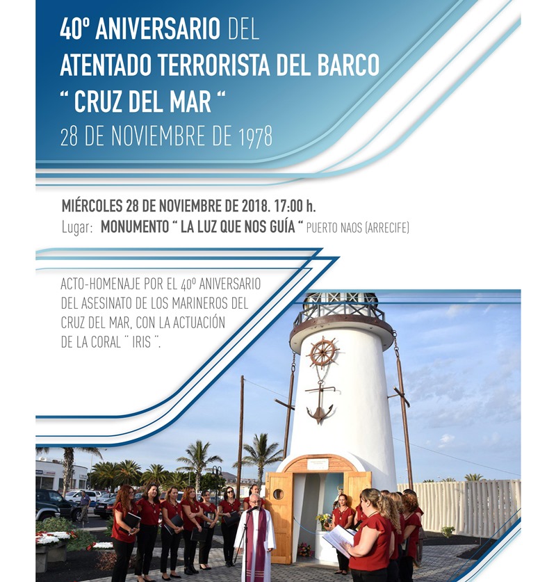 En segundo lugar, en co-organización con el Cabildo de Lanzarote y el Ayuntamiento de Haría, también invitan a la ciudadanía lanzaroteña a otros dos actos por el 40º Aniversario del atentado terrorista al barco " Cruz del Mar ", que se celebrarán en Haría y Arrecife, los días 27 y 28 de Noviembre de 2018. Así en el Faro de Puerto Naos se llevará a cabo un acto de homenaje a los fallecidos a partir de las 17 horas con la actuación del Coro Iris del mar.