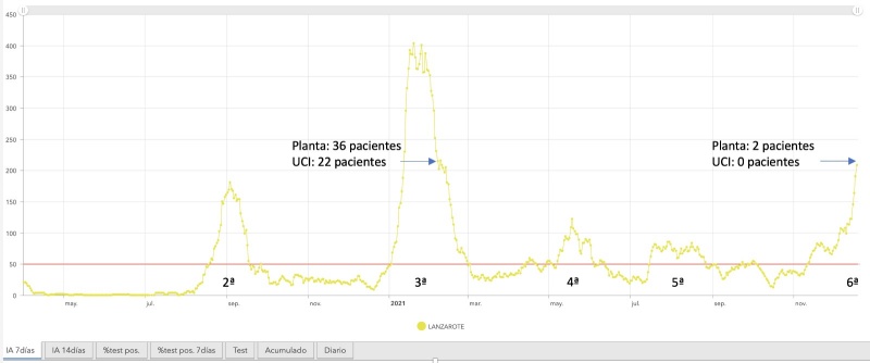 Para el director-gerente del Hospital Doctor José Molina Orosa, José Luis Aparicio, esa es la gran diferencia en relación a la tercera ola que vivió Lanzarote tras las pasadas Navidades en las que llegamos a una situación límite y de desbordamiento al tener 36 pacientes en la sala Covid 19 y 22 en la UCI, nada que ver, como se observa en la gráfica, con la situación actual, donde hay muchos más contagiados pero pocos ingresos hospitalarios por Covid 19 en Lanzarote.