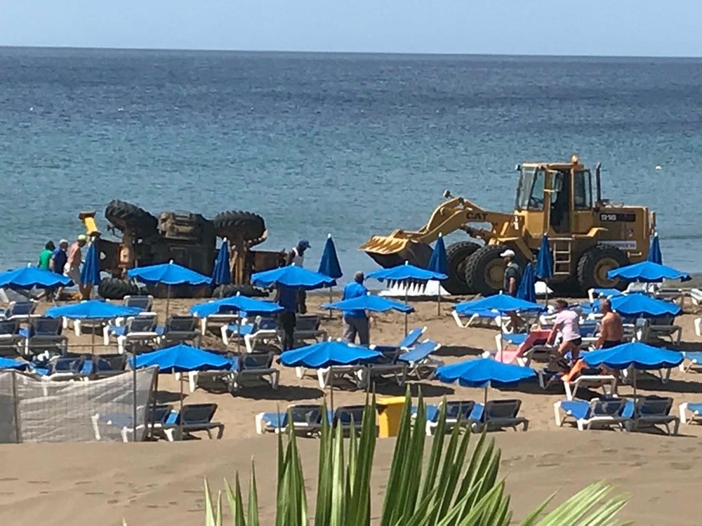 Una máquina elevadora que trabajaba en la zona para los montajes del Ironman volcó en la orilla del mar en la Playa Grande de Puerto del Carmen, actuando rápidamente la Policía Local de Tías para evitar derrames de combustible.