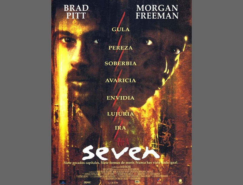 Va de los siete pecados capitales. Mucha gente no sabe cuáles son y todos tenemos nuestros pecados. Seven está protagonizada por Brad Pitt, Morgan Freeman, Kevin Spacey y Gwinedd Paltrow. Va de un asesino en serie que va cometiendo cada asesinato según un pecado capital. Habla de la gula, avaricia, pereza, la lujuria, la soberbia, la envidia y la ira. Los propios protagonistas pecan. Se demuestra de que nadie está exento de pecado y al final es clave todo tanto en la investigación como en el desenlace final de la película.