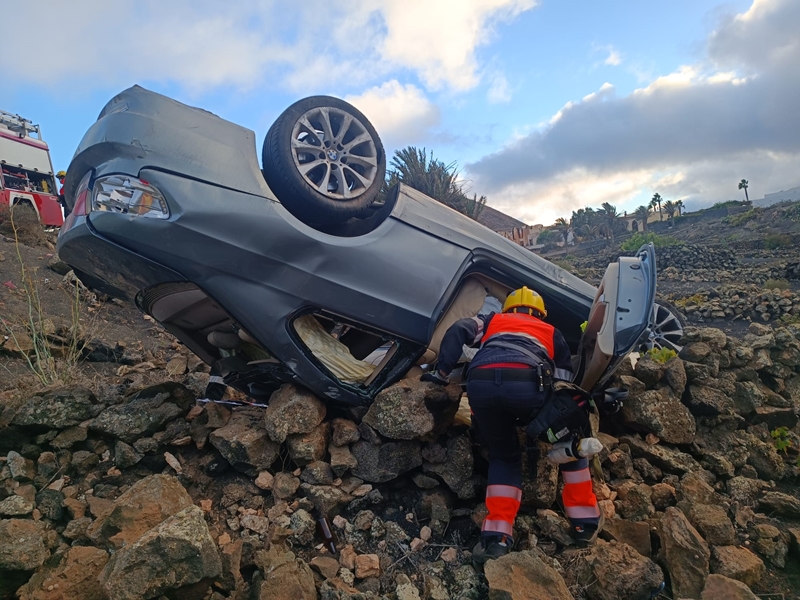 El coche se salió de la vía y volcó de forma aparatosa contra los zocos de piedra que hay en la zona. Los bomberos accedieron al vehículo, desconectaron la batería y dejaron el turismo accidentado correspondientemente balizado.