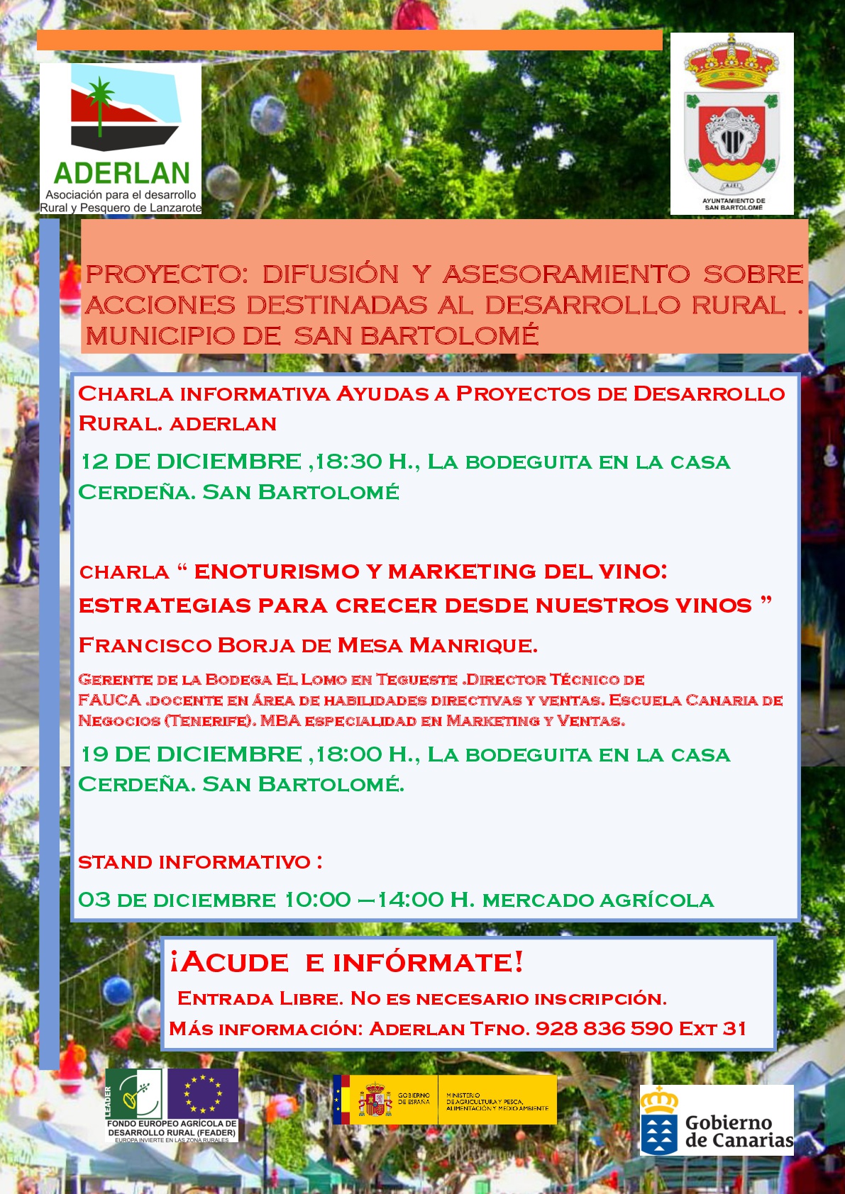 - Stand Informativo: Domingo 3 de diciembre de 10:00 a 14:00 horas. Mercado Agrícola, Plaza León y Castillo – San Bartolomé. Estás actividades de difusión y asesoramiento están destinadas a empresarios/as, emprendedores, asociaciones y a aquellas personas interesadas en desarrollar proyectos en esos ámbitos.