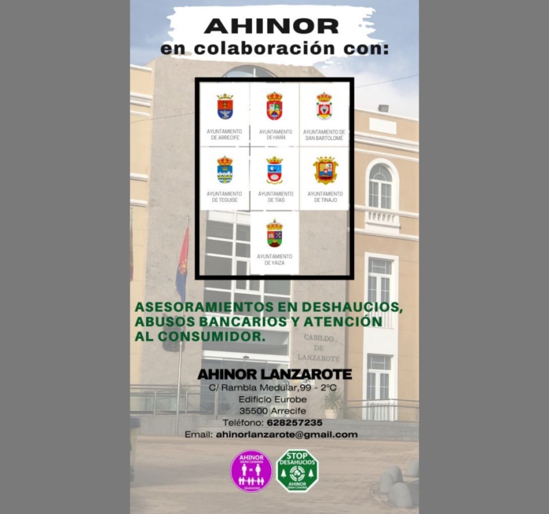 La Plataforma de afectados por la hipoteca Ahinor Lanzarote organiza, en colaboración con los siete ayuntamientos de la isla, organiza unas jornadas de vivienda centradas en Asesoramientos en desahucios, abusos bancarios y atención al consumidor.