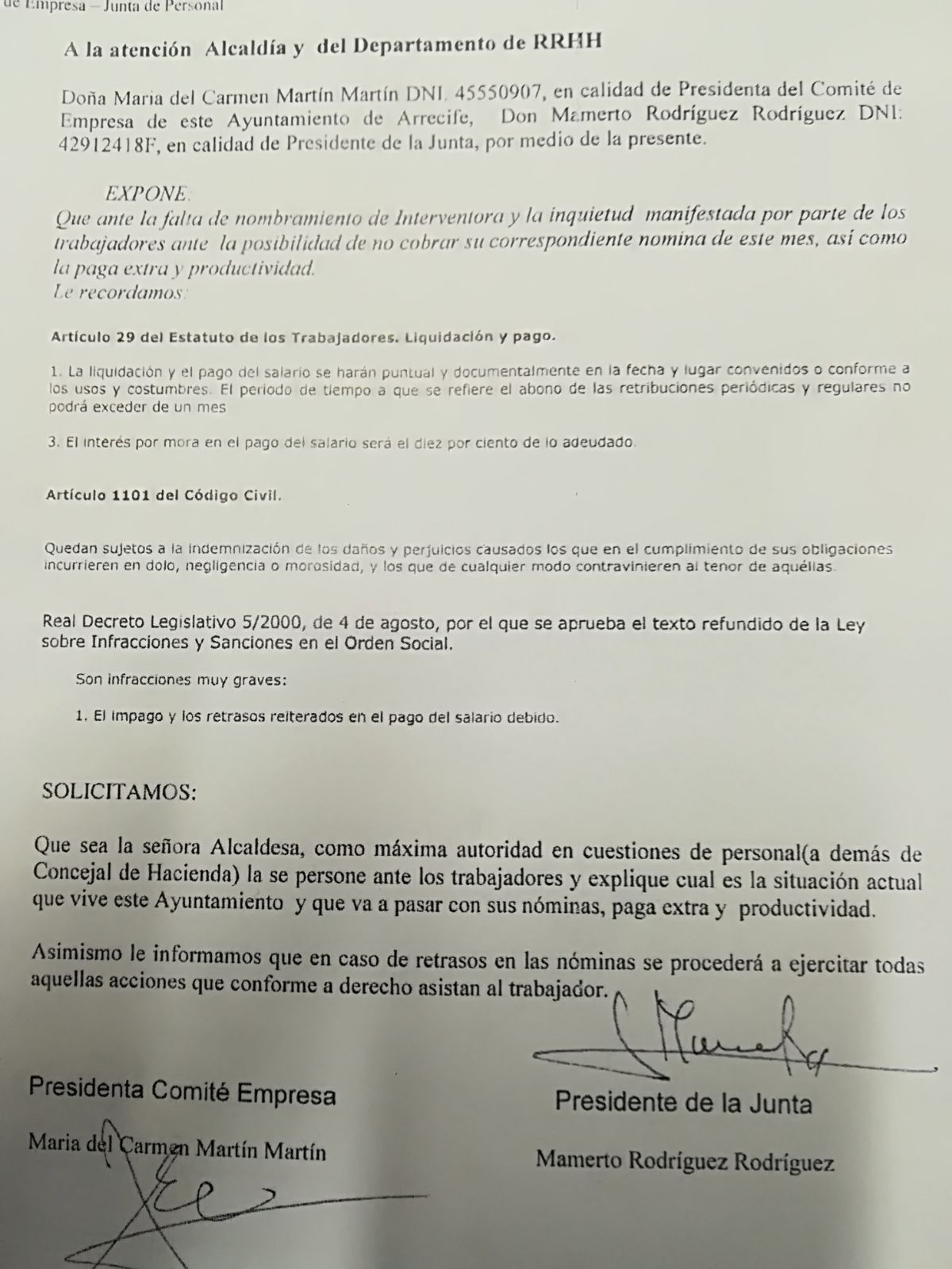 La presidenta del Comité de Empresa, María del Carmen Martín, y el presidente de la Junta de Personal, Mamerto Rodríguez, han remitido una carta a la alcaldesa, en la que le recuerdan que el Real Decreto 5/2000, de 4 de agosto, establece como “infracción grave” “el impago y los retrasos reiterados en el pago de los salarios debidos”.