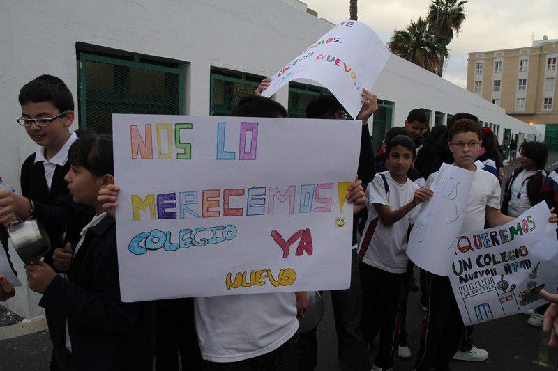 La manifestación tuvo lugar minutos antes de las 8:30, horario de entrada al colegio. Los alumnos portaban pancartas en las que podía leerse “Este colegio es una ruina”, “Colegio nuevo ya”, y “Menos reuniones y más soluciones”, entre otras, mientras los padres protagonizaban una “cacerolada”.
