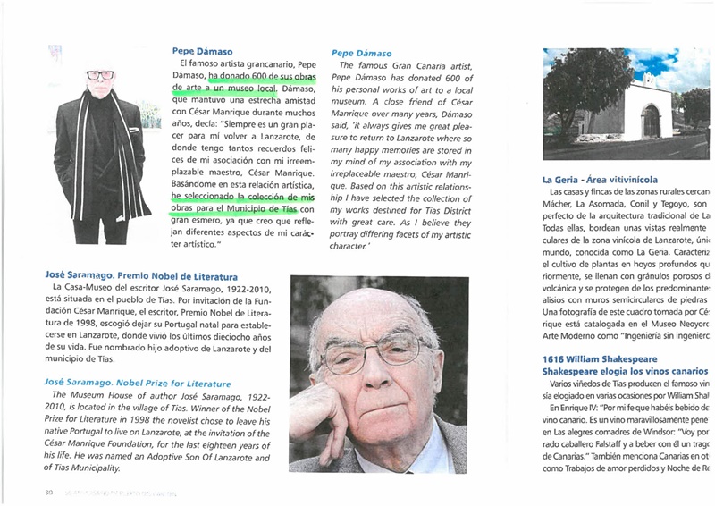 Según explica Vizcaíno, el error estaba en un pequeño folleto que se realizó por el 50 aniversario de Puerto del Carmen y que se llevó a la feria turística. En él, según el edil, se recoge la donación de 600 obras por parte de Pepe Dámaso para un museo en Tías y declaraciones del artista. Sin embargo, se habla del museo pero sin poner la palabra "futuro". "Fue un error que se nos pasó", indica.