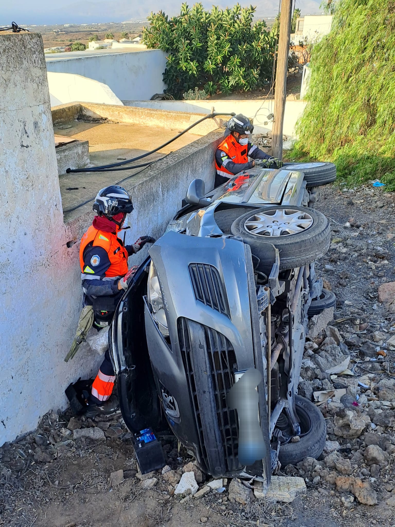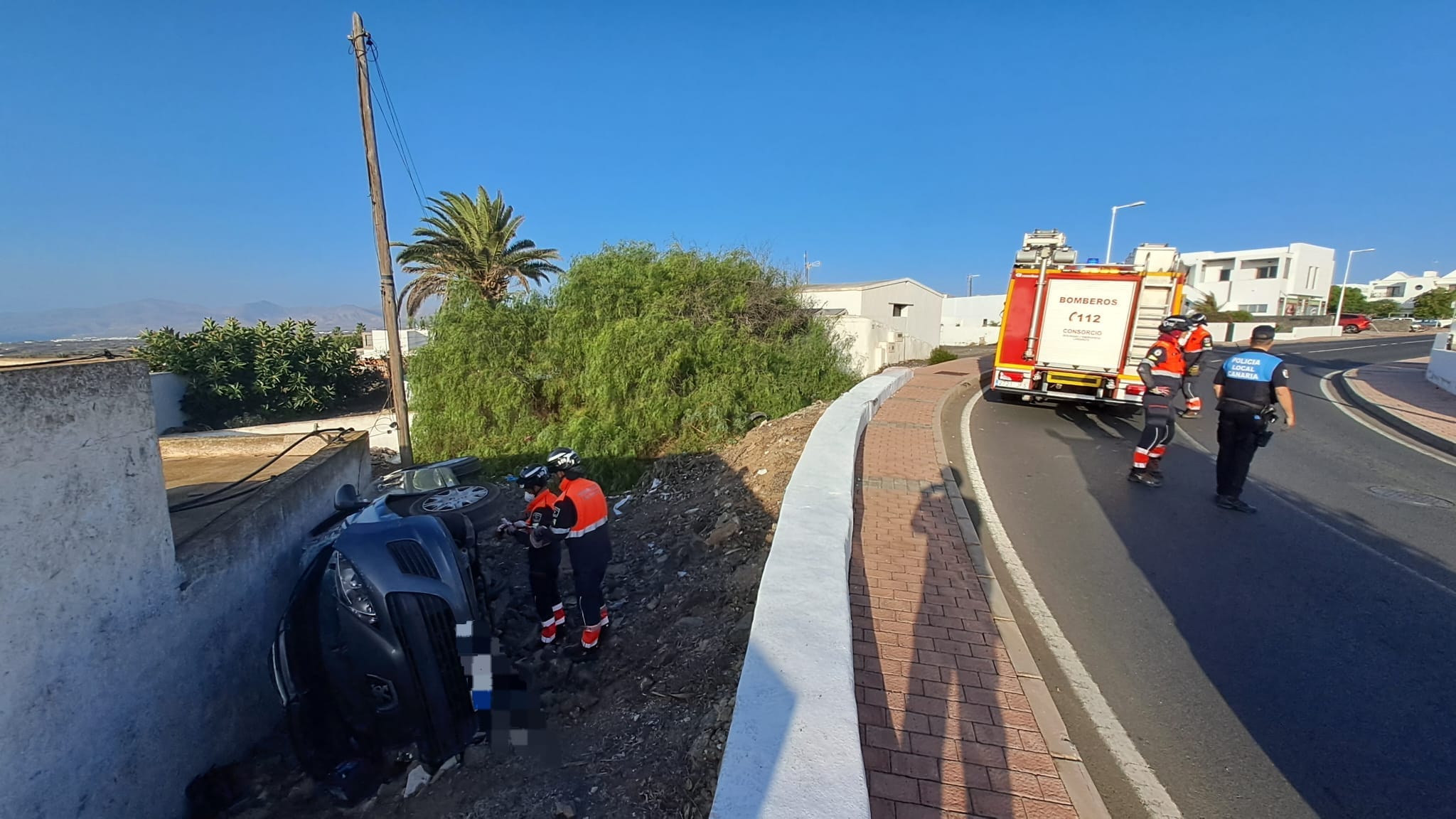Los Bomberos y la Policía Local de Tías balizaron la zona y recuperaron la documentación y el teléfono móvil del conductor que se habían quedado dentro del coche.