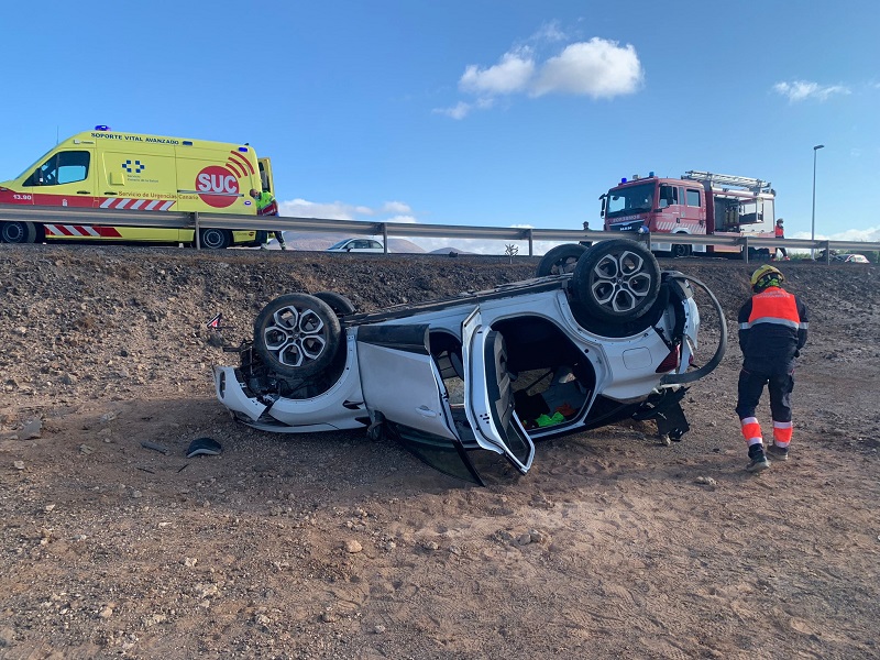 Un varón de 80 años acaba de sufrir un accidente en al LZ-40 a la altura del Rancho Texas. El conductor se salió de la vía provocando un vuelco en el vehículo que se quedó como ven en la fotografía. Los servicios de Emergencia procedieron a la extracción de la persona con un tablero espinar.