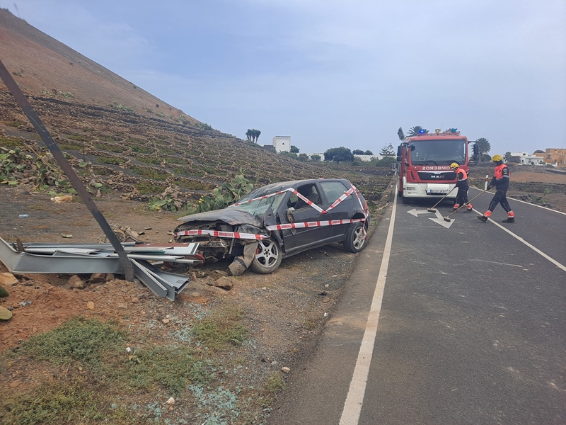 Eran las 11.43 hora de la mañana de este sábado cuando el Centro de Coordinación de Emergencias y Seguridad, CECOES, informaba a los servicios de emergencia de Lanzarote de un vuelco sin atrapados en la carretera LZ-409 de Mozaga al Peñón.