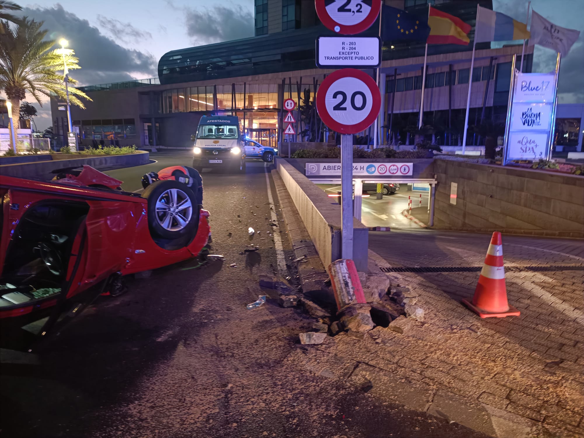 Aparatoso vuelco de madrugada en la rotonda del Gran Hotel de Arrecife