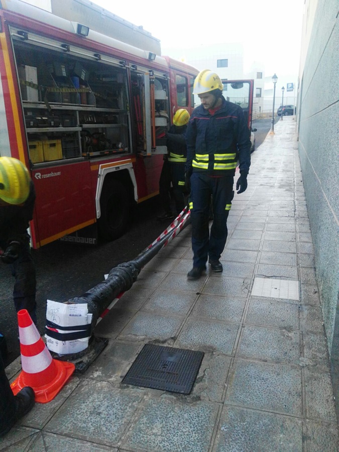 Esta mañana los bomberos del Consorcio de Seguridad y Emergencias de Lanzarote procedieron a desconectar y a tumbar en el suelo una farola que se encontraba suelta en su base y estaba apoyada en la fachada de una casa.