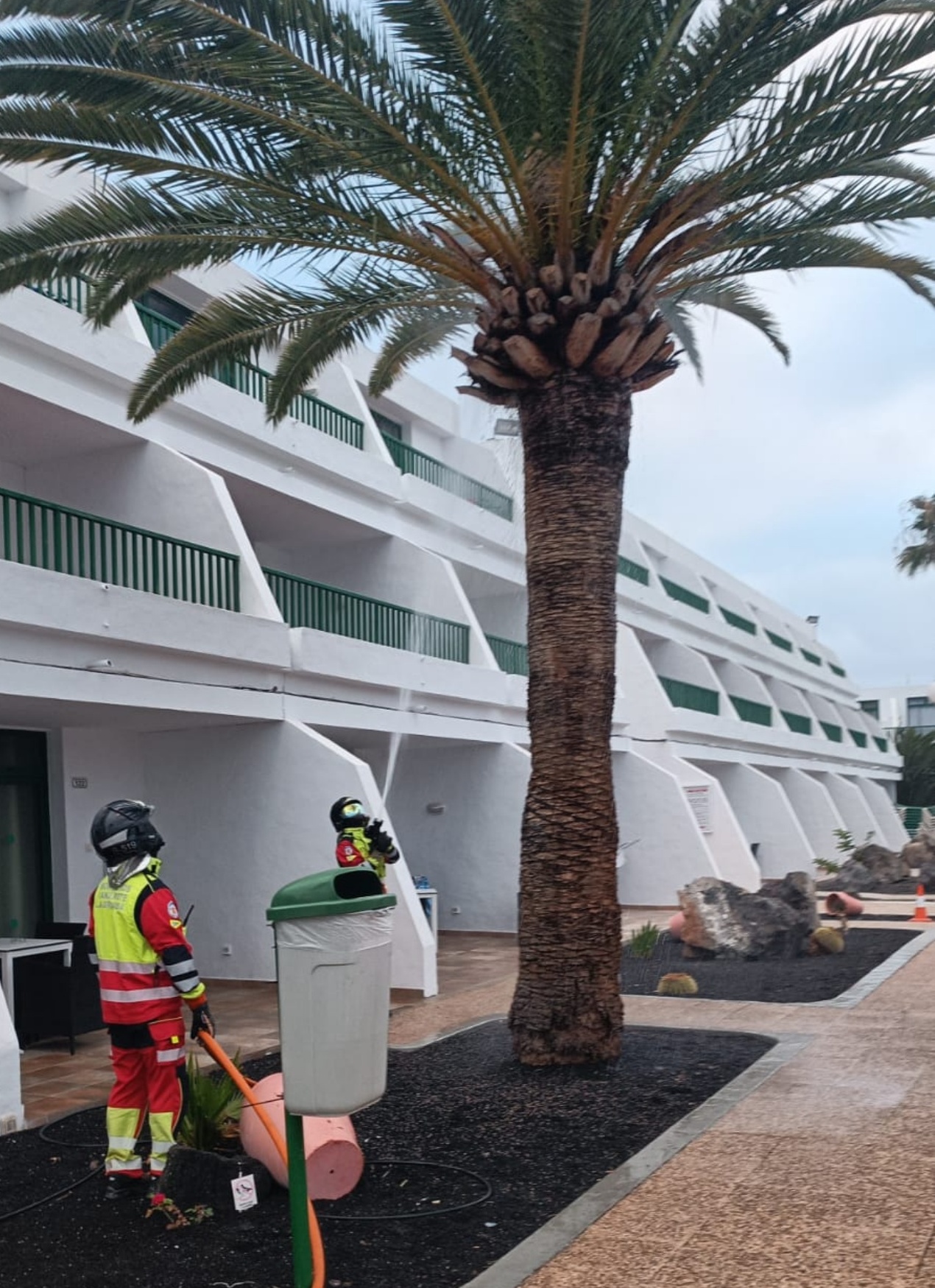 La actuación de los bomberos a primera hora de la mañana de este domingo impidió males mayores dado que la palmera está en una zona cercana a los balcones del complejo turístico.