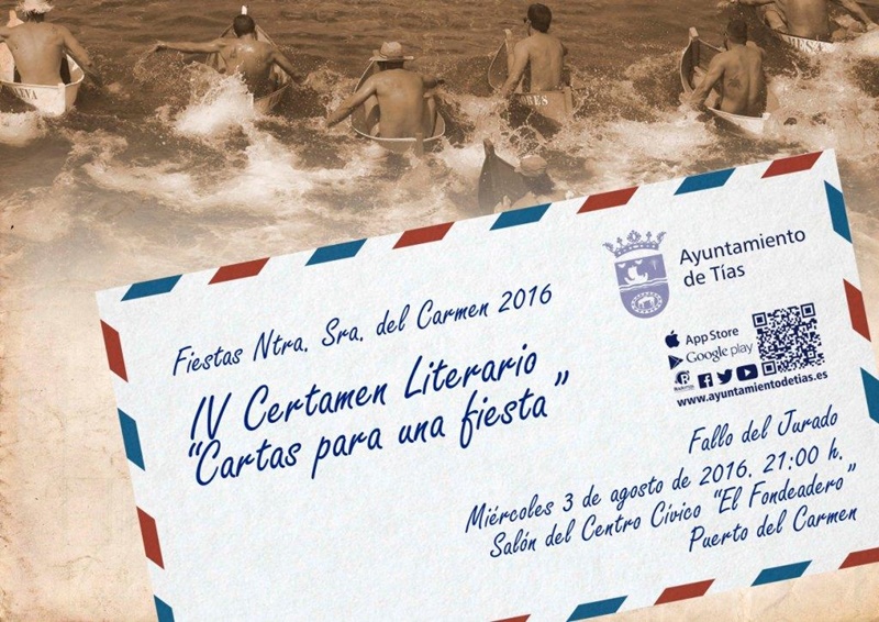 Ante la inminente llegada de las fiestas patronales de Puerto del Carmen, en honor a Nuestra Señora del Carmen, el Ayuntamiento de Tías repite concurso literario y ya ha puesto en marcha una nueva edición del Certamen literario “Cartas para una fiesta", con el fin de difundir e incentivar la participación en los eventos populares que se han programado este año desde el 25 de julio al 7 de agosto.